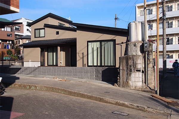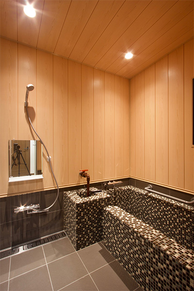別府市郊外に建つ天然温泉付き住宅。1部2階の落ち着いた外観。玄関ドアを開くと正面にはニッチ、サイドには階段室に繋がる吹き抜けと造り付カウンターが待ち受けます。リビングの勾配天井と造り付収納もこの家の価値を高めています。そして何よりも温泉地別府の家。天然温泉が、住む人の1日の疲れを癒してくれます。